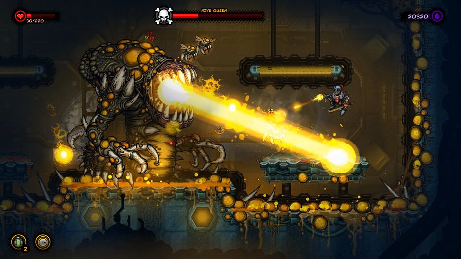 - Dynamiczny platformówkowy gameplay oparty na strzelaniu, broni białej i granatach